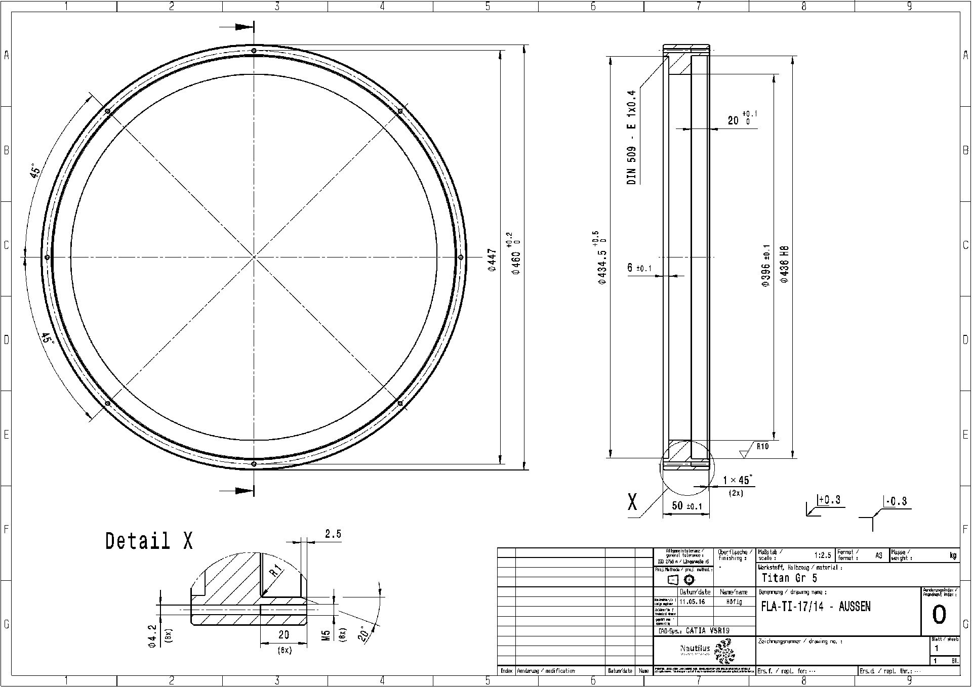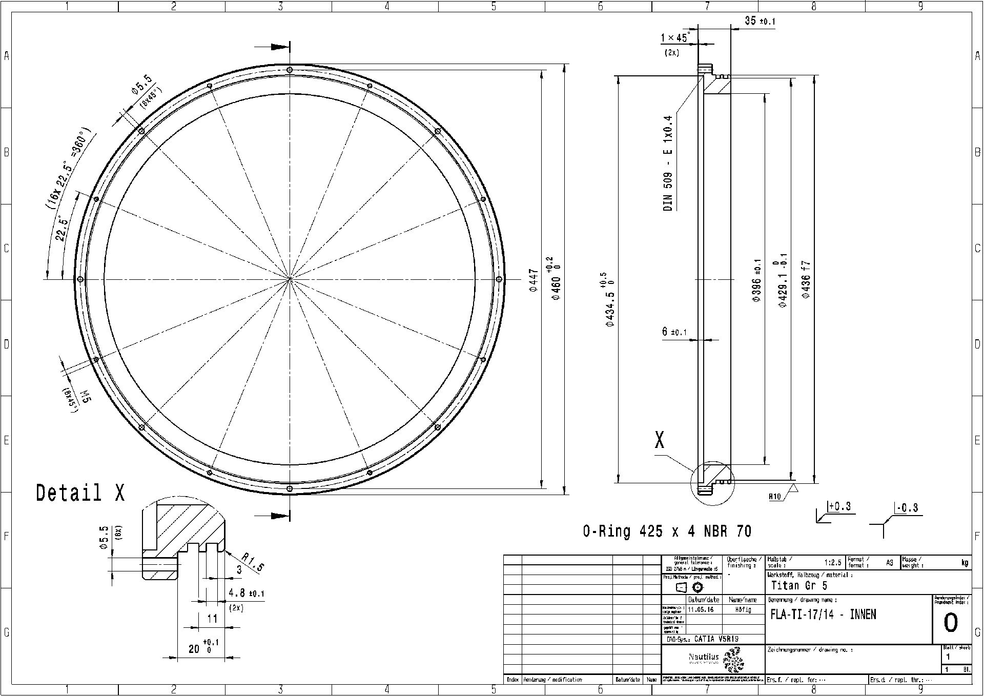 | Flanges provide an alternative solution to open and close spheres. They are often made of Titanium due to similar thermal expansion coefficients. Stainless steel or plastic flanges could also be feasible for short term deployments or shallow water applications. Leak tightness is achieved, similar to any other non-glass housings, by means of o-rings between two flanges. Nautilus Marine Service provides a default flange design and can also manufacture according to customer’s needs. The glass housing is bonded to the flanges using a commercially available adhesive. For customers who like to apply their own flanges to glass housings, Nautilus Marine Service has a bonding instruction available as well as corresponding tools and adhesive. Please note: In general, glass housings are very strong against pressure, but do not have the same qualities against tension or shear or torsion. So, do not install glass housings at platforms where they are subjected to such forces. This is particularly important for housings which have been furnished with metal flanges. Do not use those flanges as mounting support on flexible surfaces. Downloads: Drawing NMS-FLA-Ti-17-I , 3D model (3D) NMS-FLA-Ti-17-I | |