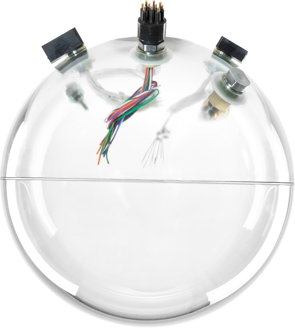 VITROVEX instrument housings are available in either spherical or cylindrical shape; each with different sizes and pressure ratings up to full ocean depth.